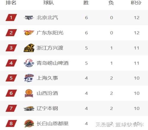 CBA常规赛第6轮全部战罢,广东、北京、山西以及新疆等队悉数出战,北京队和广东队继续高歌猛进,分别战胜新疆队和山东队,豪取6连胜。卫冕冠军广厦紧随其后,排在积分榜第三位,而青岛这一轮掀翻山西队以后,他们也成功杀进积分榜前四。由于北京、广东以及青岛等队相继赢球,四冠王辽宁队排名直线下滑,从积分榜前四名,直接下滑到积分榜第7名。