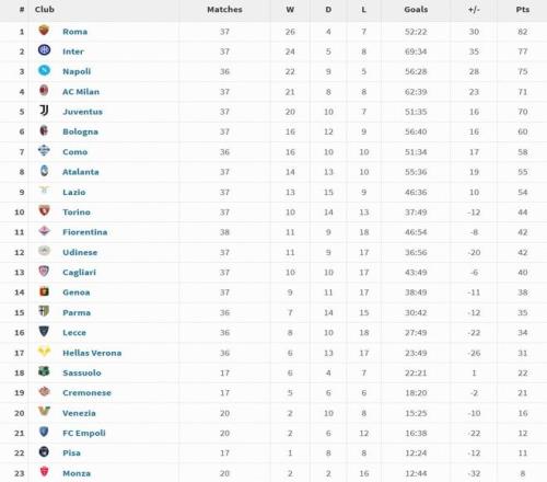 意甲2025年度积分榜:罗马37场26胜82分居首,国米次席