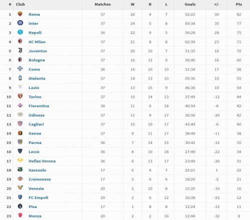 意甲2025年度积分榜:罗马37场26胜82分居首,国米次席 -