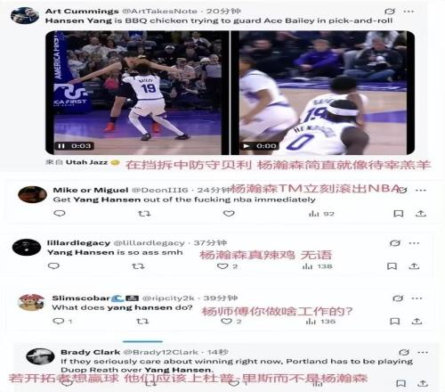 3分钟47秒,杨瀚森2次犯规1次失误,连续被对手进攻打成,他在场上不仅拖慢球队的进攻速率,在防守端也是漏勺一般的存在,主教练不给他上场时间也是应该的。赛后愤怒的美国网友、开拓者球迷纷纷留言,“杨瀚森真辣鸡,无语”、“杨师傅你是做什么工作的”、“在挡拆中防守贝利,简直是待宰的羔羊”,更有球迷直接怒吼“杨瀚森立刻滚出NBA”。