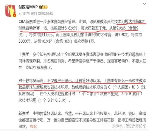 很显然,对于CBA上赛季不少球队的做法,篮协和CBA方面还是不大满意。这不,在2025-26新赛季,篮协和CBA方面就重点强调了球员和教练员的赛场作风。为了让球员和教练员更为“谨慎”,篮协方面针对技术犯规处罚和罚款,又增加了力度。新赛季,无论是球员还是教练员,一旦技术犯规达到6次以上,将会被直接罚款,而达到8次者,将会被自动禁赛一场。